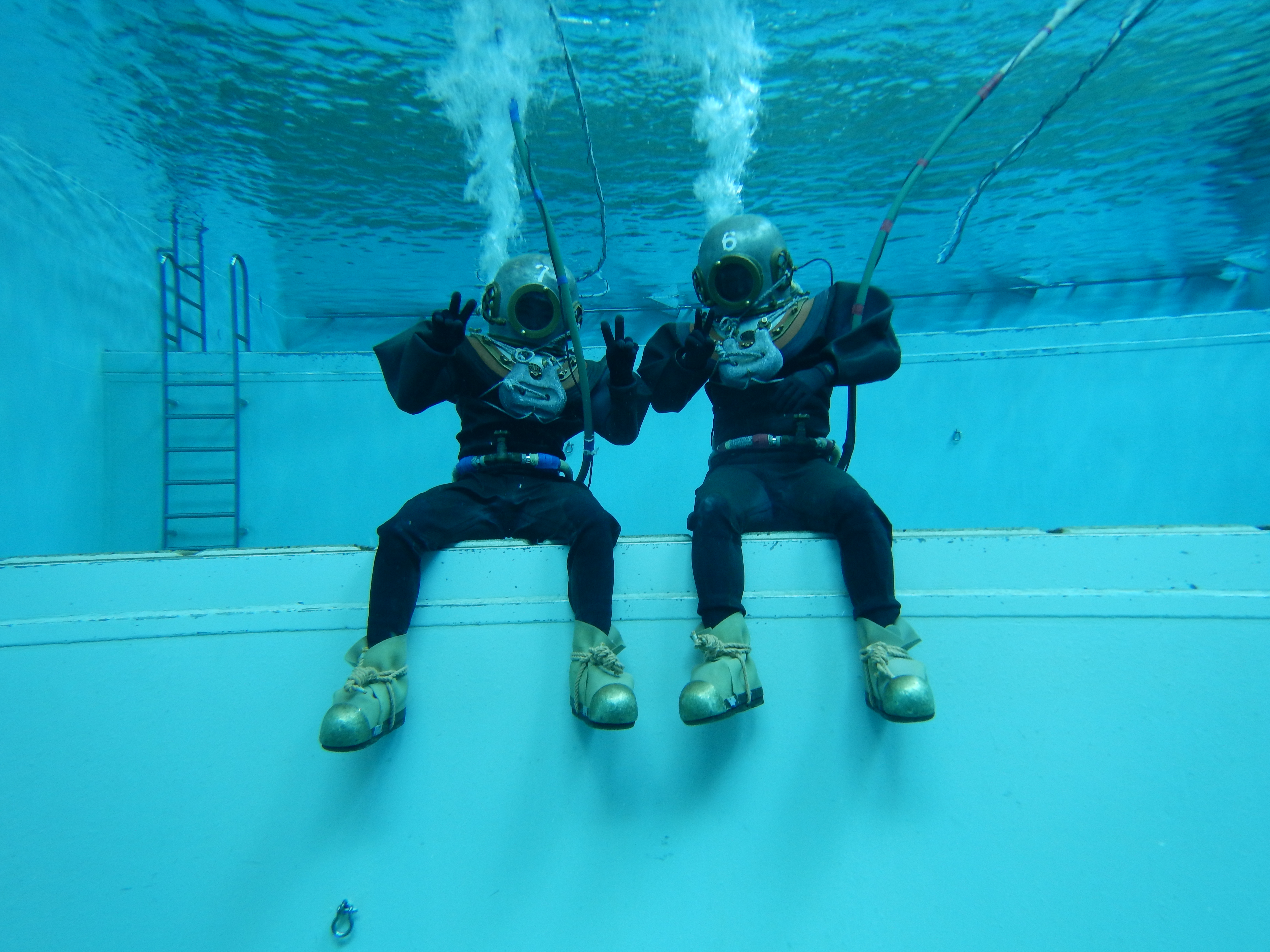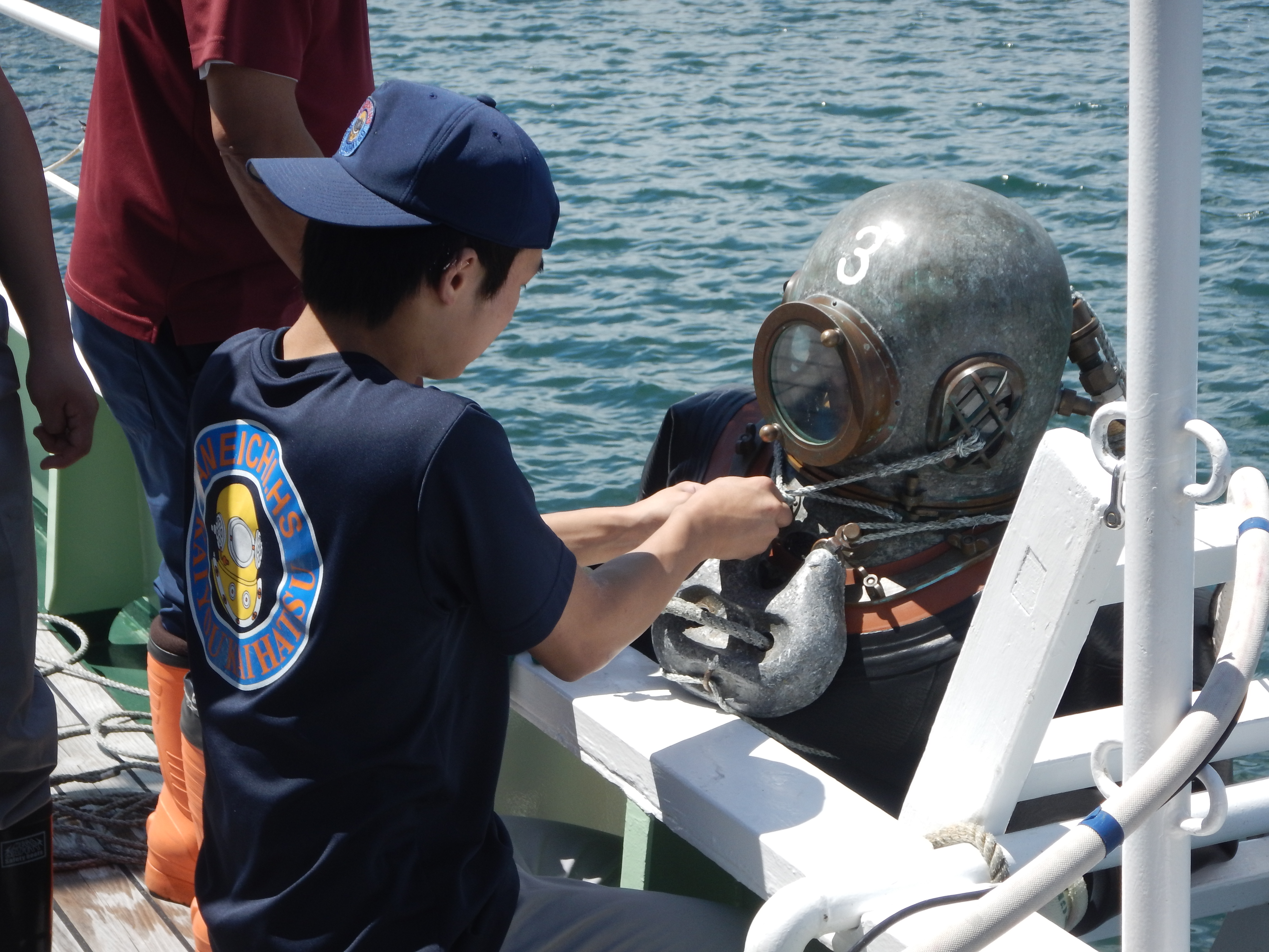 日本で唯一、潜水と土木の知識と技術を学べる学科があります。1.2m、3m、5m、10mの水深を持つ階段式プールにおける潜水実習、潜水作業実習船「種市丸」を使用した海洋における実践的な潜水実習が行われます。アーク溶接、ガス溶断、測量などの実習も充実しており、卒業生は国内外で海洋工事に携わる技術者として活躍しています。